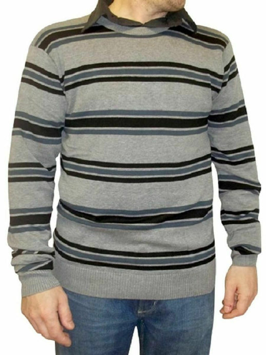 Mens Grey & Black Multi Striped Cotton Rich Knitted Jumper