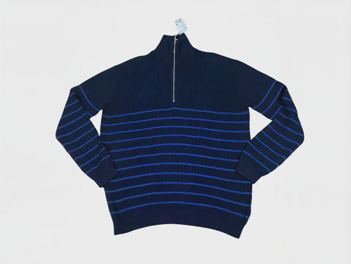 Mens Navy & Blue Stripes Rib Organic Cotton High Neck Half Zip Longsleeve Jumper