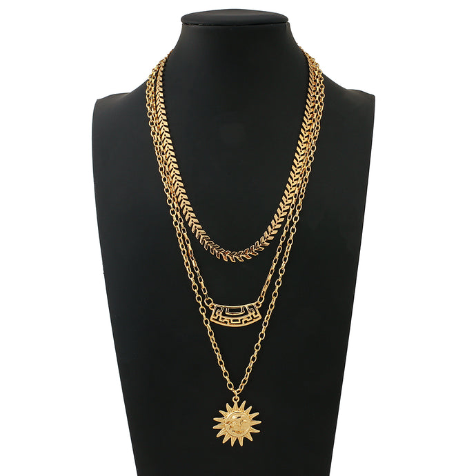 Ladies Gold 3Tier Multi Layer Sun Cutout Wall Choker Wheat Chain Party Necklace