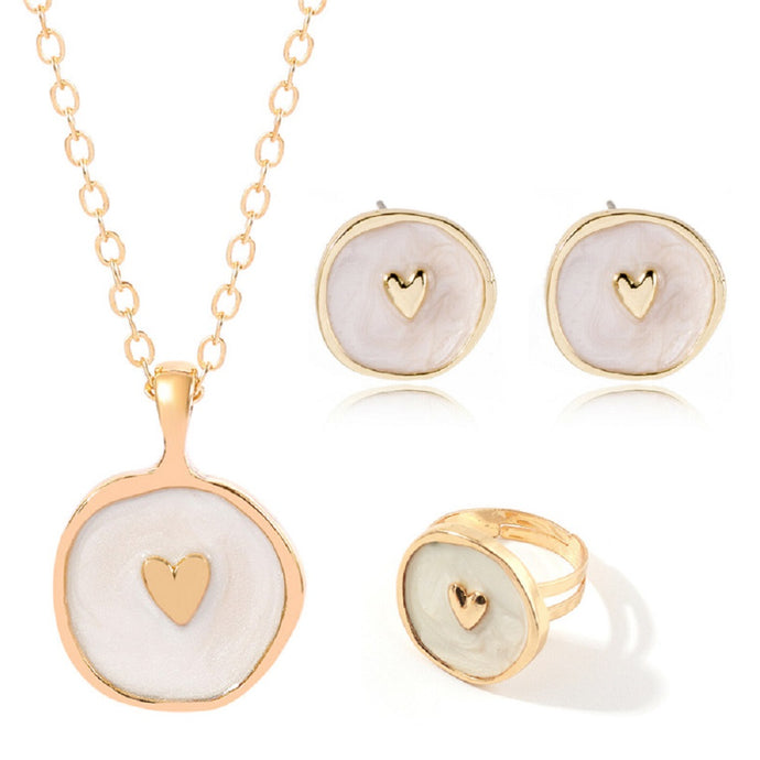 Ladies White Heart Celestial Pendant Necklace Earring Ring 4Pc Set